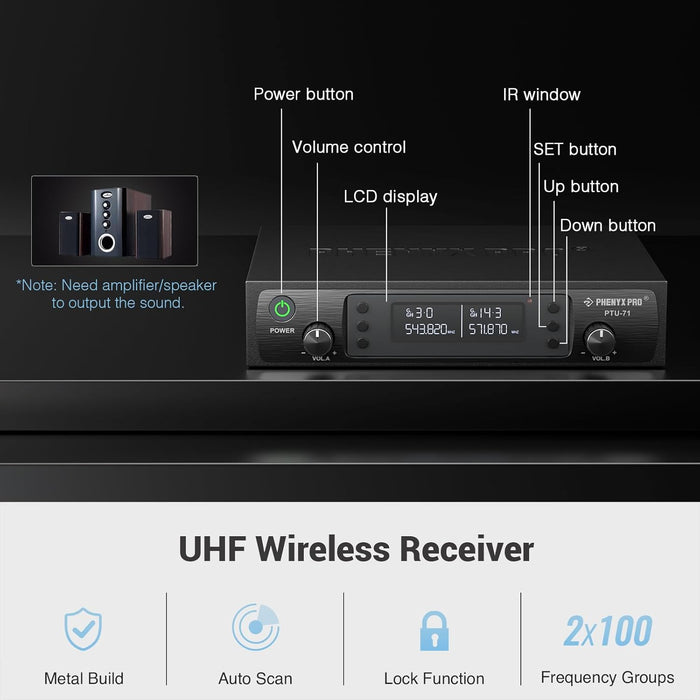 Transform your audio experience with professional-grade sound quality and unwavering reliability – the hallmarks of the Phenyx Pro PTU-71-2H Dual Wireless Microphone System.